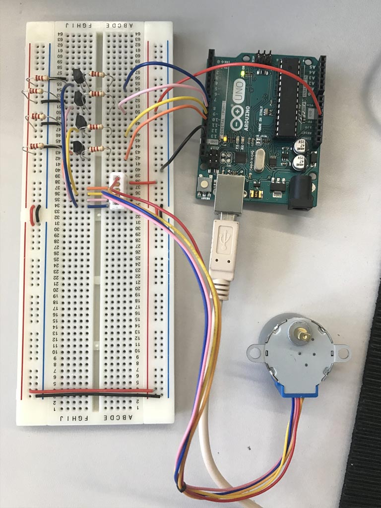Because the current draw of the stepper motor is greater than what the Arduino can supply, transistors were used to overcome this. Alternatively, a stepper motor driver board could have been used, but for this purpose transistors are fine.